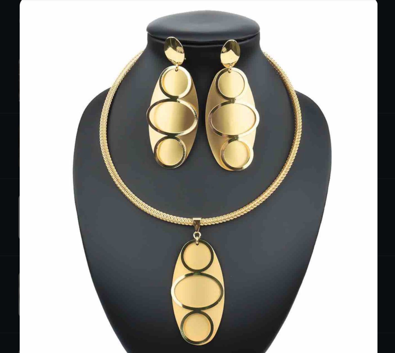 This elegant set features a stunning ear ring and necklace combination, adding a touch of beauty to any outfit. Made with quality craftsmanship, this set is a must-have for any fashion-forward individual. Elevate your style with this sophisticated and chic accessory.
