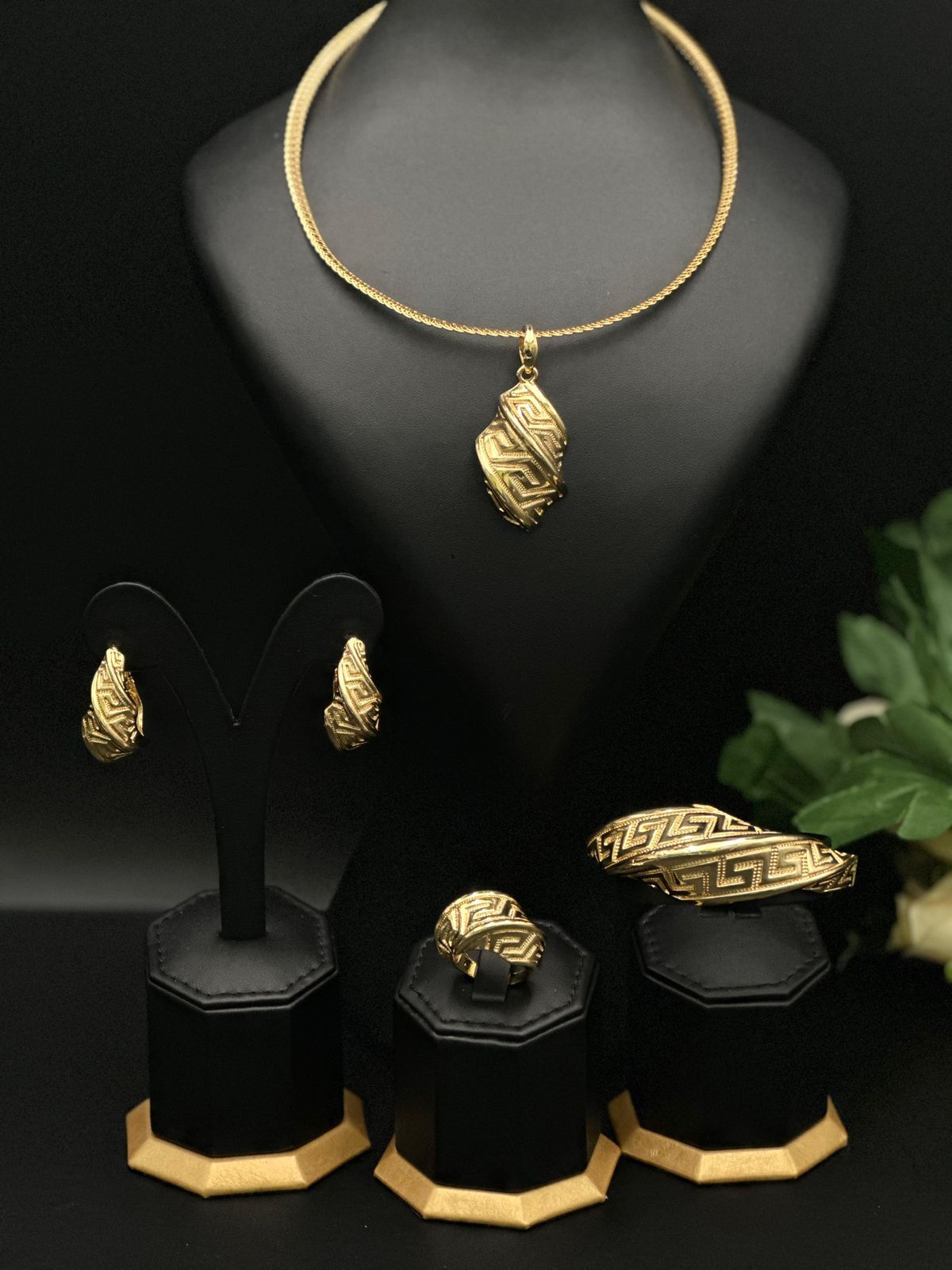 This elegant set of ear rings, ring, necklace, bracelet is designed to be the perfect addition to any outfit. Crafted with exquisite attention to detail, its beautiful design is sure to impress. Elevate your style with this stunning combination of jewelry, perfect for any occasion.