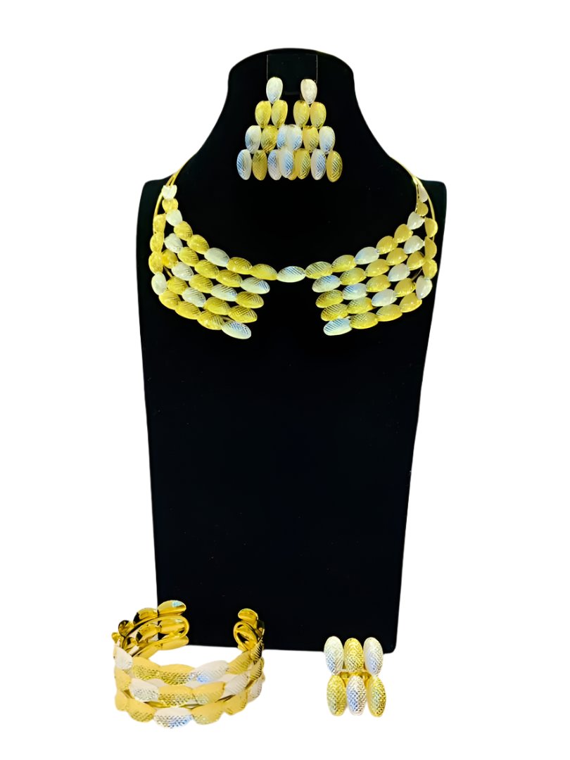 Enhance your style with our beautiful jewelry set, including an ear ring, ring, necklace, and bracelet. Perfect for any occasion, these pieces will add elegance and charm to your outfit. Show off your impeccable taste with our stunning combination.